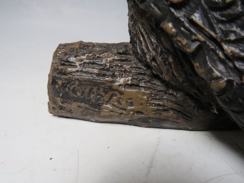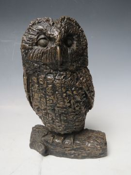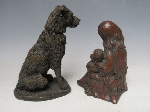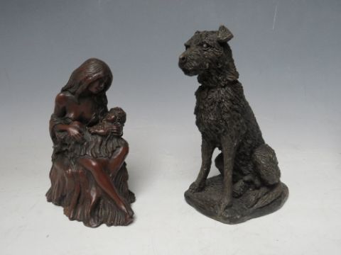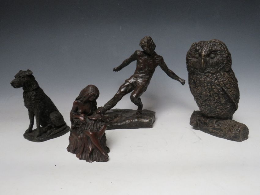 TWO KEITH LEE FIGURES CONSISTING OF AN OWL & A DOG TOGETHER WITH TOW JOHN LETTS FIGURES - A FOOTBALLER AND A MOTHER WITH CHILD, TALLEST H 32 CM (4)