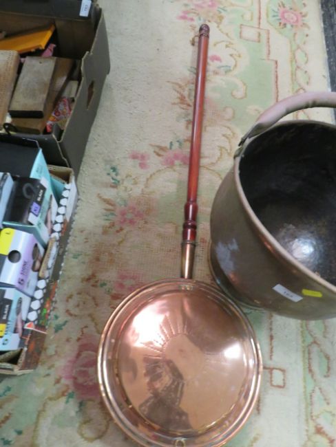 A BRASS COAL SCUTTLE TOGETHER WITH A COOPER WARMING PAN, GILT FLORAL MIRROR AND A MODERN FRAMED DRAWING (4)