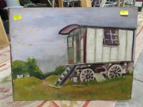 A 20TH CENTURY OIL ON BOARD OF A GYPSY CARAVAN WITH A PORTRAIT STUDY VERSO