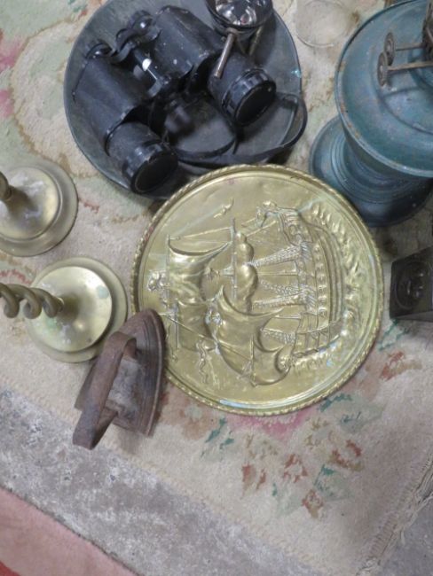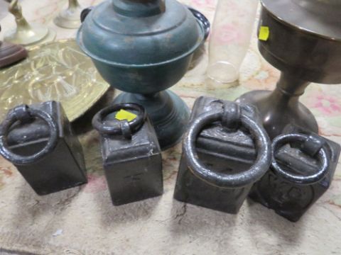 A TRAY OF ASSORTED METAL WARE TO INCLUDE SET OF 4 WEIGHTS, BRASS CANDLESTICKS ETC