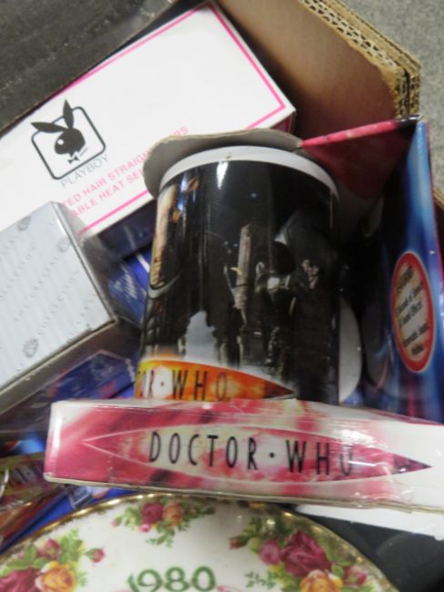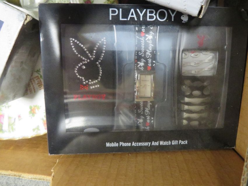 A TRAY OF VINTAGE COLLECTABLE'S INCLUDE PLAYBOY BOXED ITEMS, ROYAL ALBERT TELEPHONE AND PLATE, BOXED CRYSTAL ETC