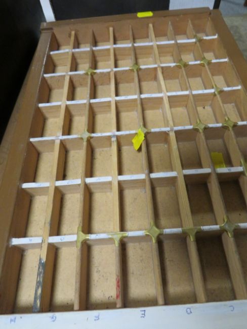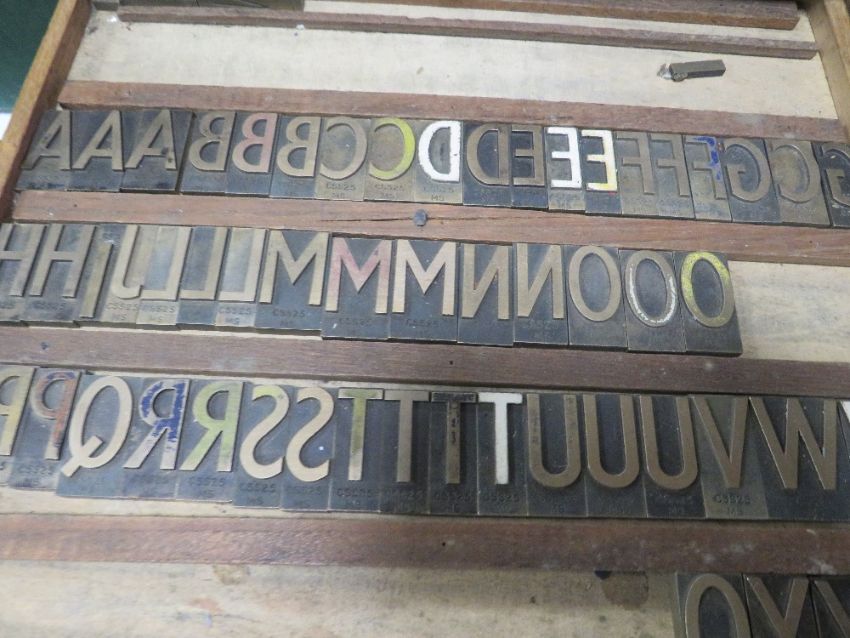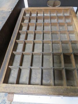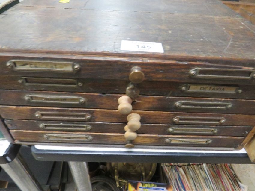 A VINTAGE SIX DRAW CHEST OF ASSORTED PRINTING BLOCKS IN DIFFERENT TYPE FACING AND THREE ASSORTED TRAYS