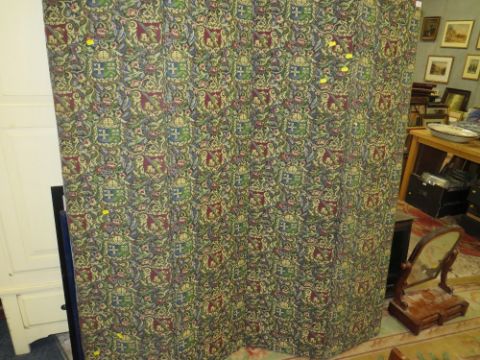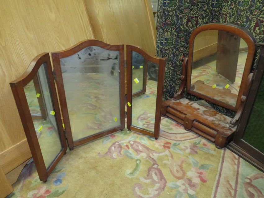 A TAPESTRY FOUR FOLD SCREEN WITH A VICTORIAN DRESSING MIRROR, SMALL CABINET AND TRIPLE MIRROR (4)