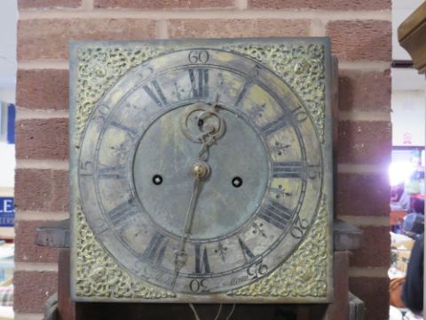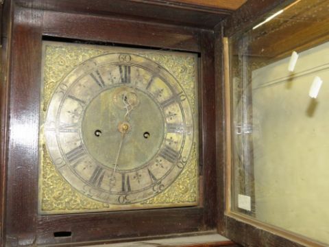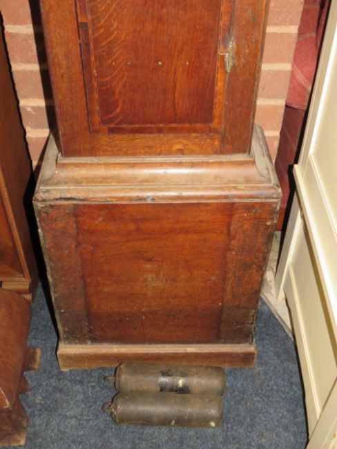 AN ANTIQUE OAK BRASS FACED LONGCASE CLOCK BY THOMAS VERNON OF LUDLOW - WITH EIGHT DAY MOVEMENT - WEIGHTS