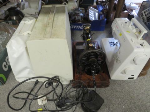 FOUR ASSORTED SEWING MACHINES TO INCLUDE A VINTAGE SINGER 150 ANNIVERSARY LIMITED EDITION EXAMPLE ETC