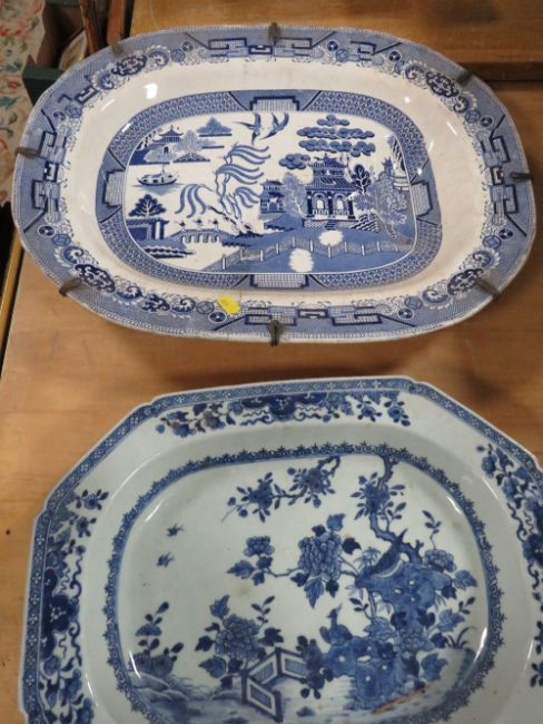 FOUR ASSORTED ANTIQUE MEAT PLATTERS TO INCLUDE BLUE/WHITE EXAMPLES