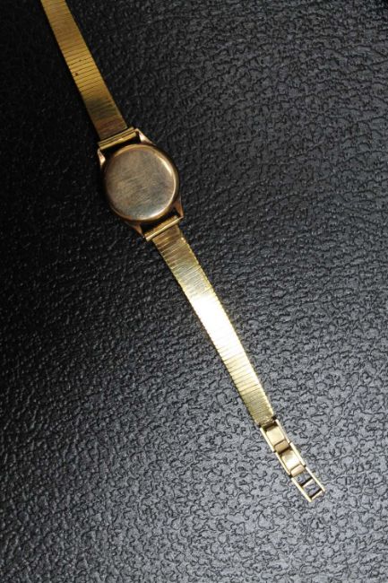 A 9 CARAT GOLD LADIES OMEGA WRIST WATCH, on replacement plated strap and lacking winder, Dia 2 cm
