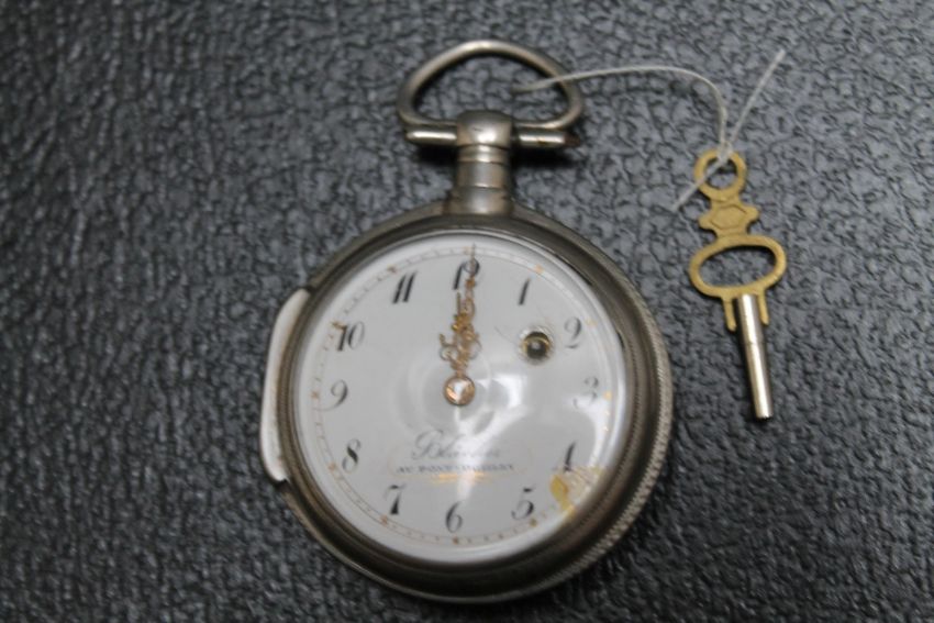 A FRENCH OPEN FACED MANUAL WIND POCKET WATCH - BLACHER AU PNT DOUILLY, with key, Dia 5 cm