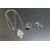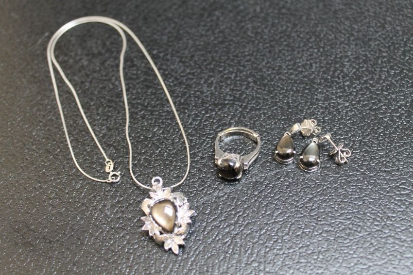A WHITE METAL PENDANT, EARRINGS AND RING SET ALL WITH IRIDESCENT STONES, possibly 'Star Sapphires',consisting of ring stamped 585 approx weight 4.7g, ring size G (with spacer), a pendant/brooch stamped 585 on a hallmarked 9ct white gold chain, height of pendant 3 cm approx weight 6.9g, chain length 45 cm, approx weight 1.8g and a pair of teardrop earrings - only butterflies stamped 585, overall weight 5.1g