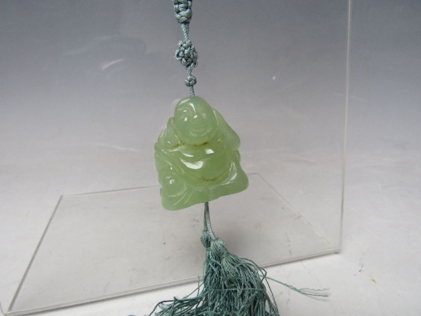 A MODERN JADE BEAD NECKLACES WITH YELLOW METAL MOUNTS, the clasp marked 9K, together with a modern jadeite pendant example (2)
