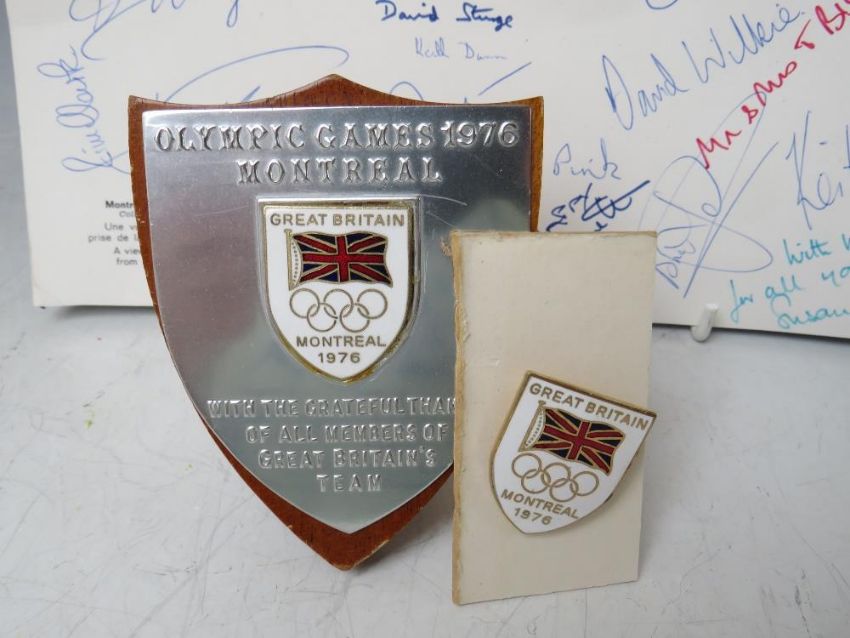 A PAGE OF BRITISH OLYMPIC TEAM MONTREAL 1976 AUTOGRAPHS, together with a small Olympic shield and an enamel badge