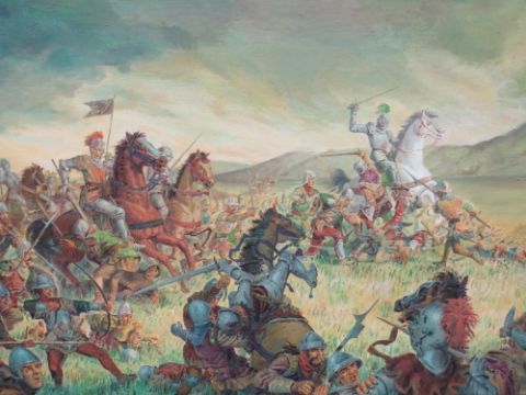 OLIVIERO FREY (1948-2022). A battle, signed lower right and dated '68, oil on board, framed, 77 x 143 cm