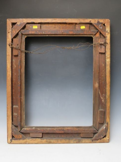 A 19TH CENTURY DECORATIVE GOLD SWEPT FRAME, frame W 10 cm, rebate 53 x 45 cm