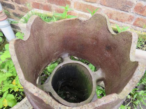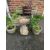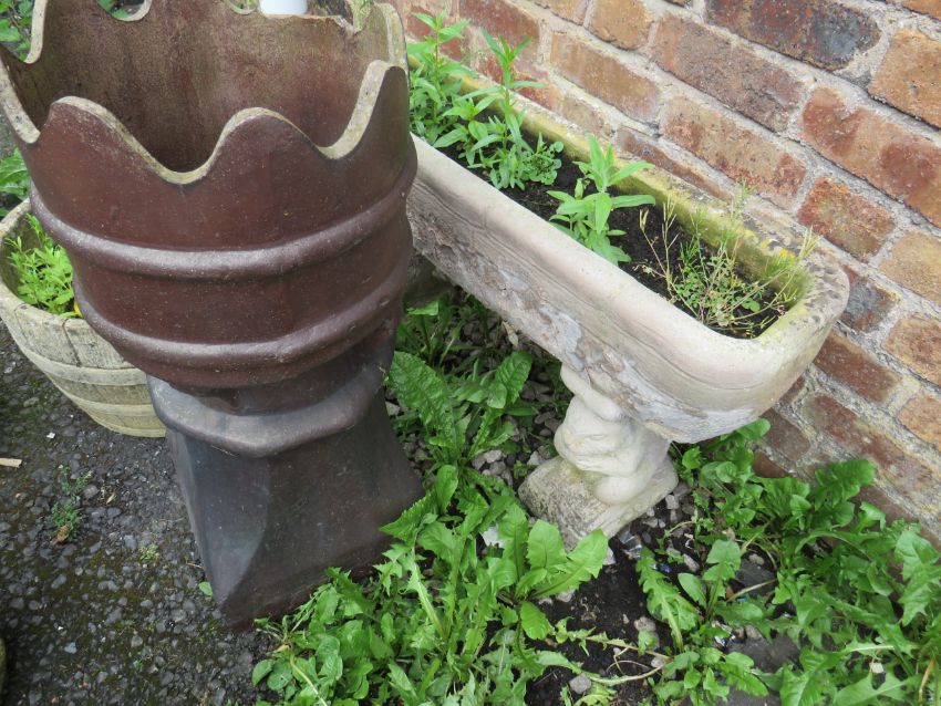 A SELECTION OF CONCRETE GARDEN PLANTERS, TO INCLUDE A CASTELLATED CHIMNEY POT AND A BIRD BATH