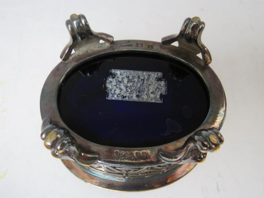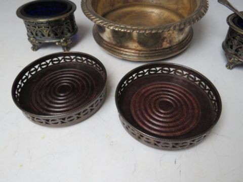 A SMALL PAIR OF HALLMARKED SILVER BOTTLE COASTERS - BIRMINGHAM 1973, Dia. 9.5 cm, along with a plated coaster and pair of Christofle salts with blue glass liners (5)