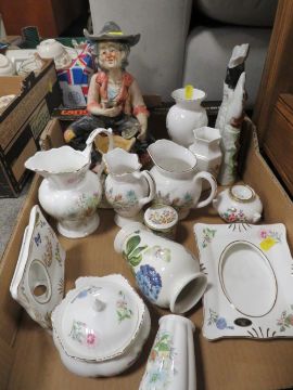 A TRAY OF ASSORTED CERAMICS TO INCLUDE AYNSLEY AND PORTMEIRION