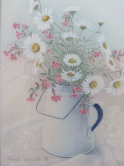 JANET SHEATH (XX). Three miniature watercolours on ivorine 'Daisies & Red Campions', 'The Gardeners Tea Break' and 'Study of a Hat on a Patio', see Society of Women Artists label verso on one, all signed, framed and glazed, 10 x 7 cm, 6 x 9 cm and 4.5 x 6 cm