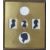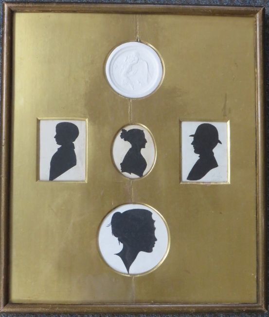 A 19TH CENTURY FRAMED SET OF SILHOUETTES ON PAPER, two rectangular, one circular, one oval and one plaster roundel, one signed C.F.P DUBLIN, framed and glazed, overall mount size, 37 x 32 cm