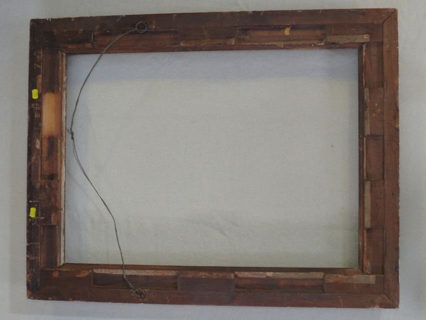 A 19TH CENTURY GOLD FRAME, with leaf design to inner edge and acanthus leaf design to outer edge, frame W 9 cm, rebate 75 x 55 cm
