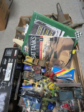 THREE TRAYS OF ASSORTED TOYS TOGETHER WITH A BOX AND CONTENTS