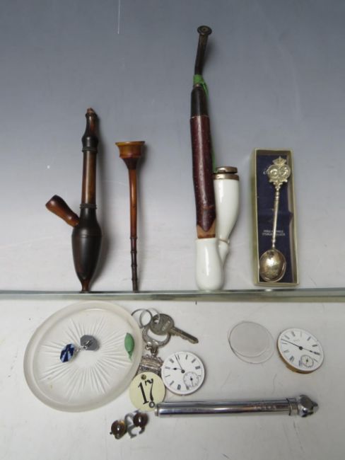 A 19TH CENTURY GERMAN PORCELAIN BOWL TOBACCO PIPE, together with a quantity of collectables