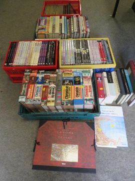 FIVE TRAYS OF HARD BACK BOOKS TO INCLUDE CHRONICLE PUBLICATIONS, HISTORICAL ATLASES ETC