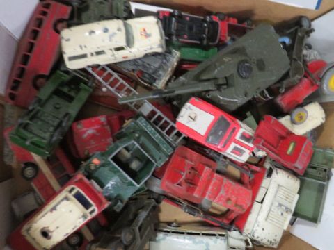 A TRAY OF PLAYWORN DIE CAST VEHICLES TO INCLUDE DINKY AND CORGI