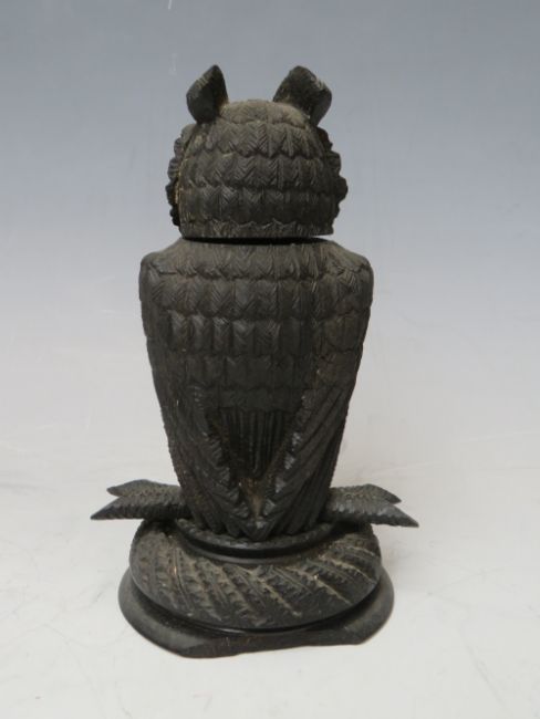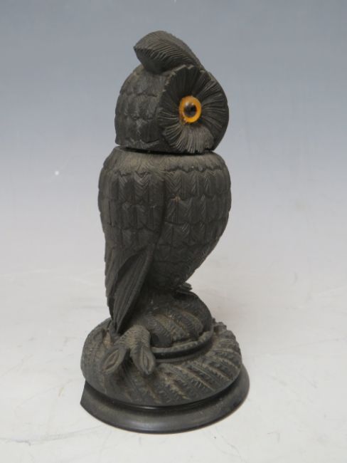 AN IRISH BOG OAK NOVELTY OWL INKWELL, H 15 cm