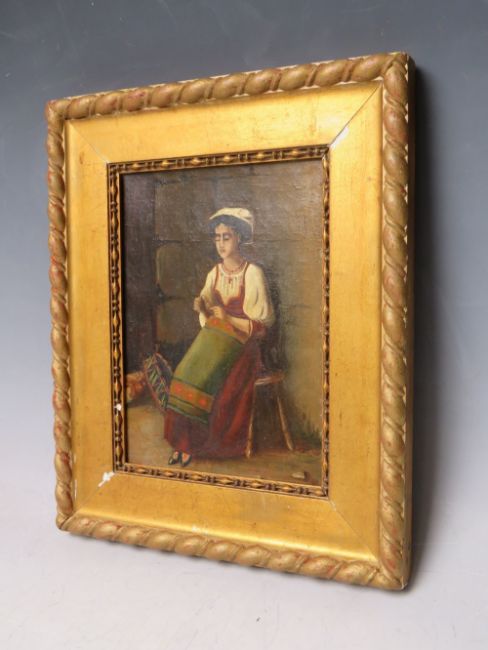 (XIX) Continental school, seated peasant woman before a wall, unsigned, oil on canvas, framed, 20 x 15 cm