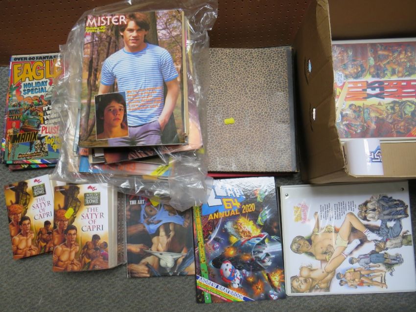 OLIVER FREY (1948-2022). A large collection of ephemera and works of art, prints etc., to include male erotic magazines, novels, stories, computer magazine prints etc.
