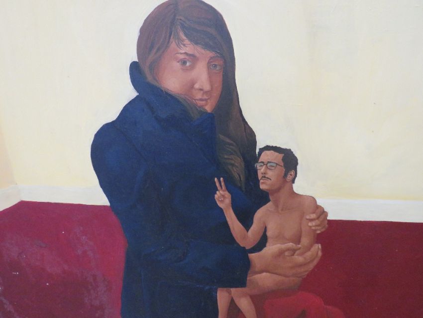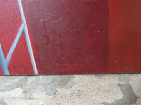 ROGER M. KEAN (XX-XXI). An abstract study of a girl holding a naked small male, signed lower centre, oil on board, 91.5 x 122 cm