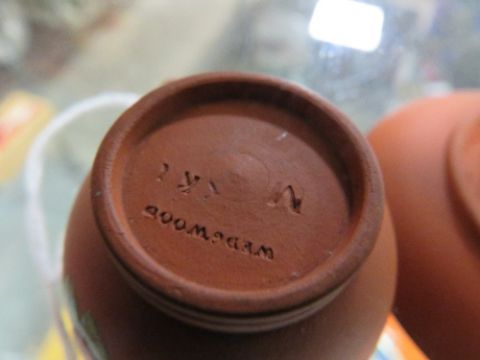 A WEDGWOOD 'ROSSO ANTICO' TERRACOTTA ENAMELLED CUP AND SAUCER