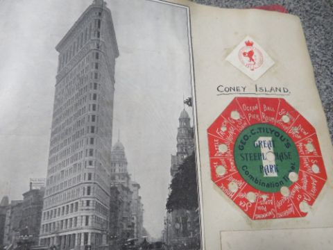 AN EDWARDIAN TRAVEL SCRAP BOOK, mostly Canada and The United States, includes a Coney island 'GEO.C. Tilyou's great steeplechase' ticket, original Chicago bread lables, an RMS Bavaria vacination card, shipping and local menus, newspaper clippings etc