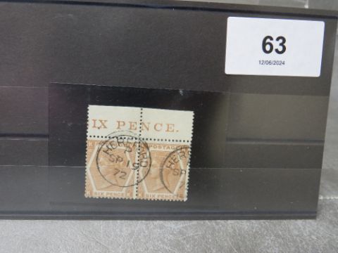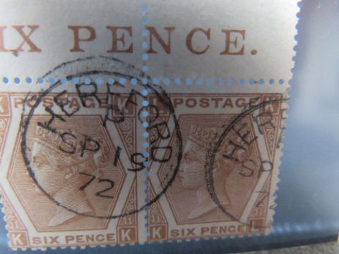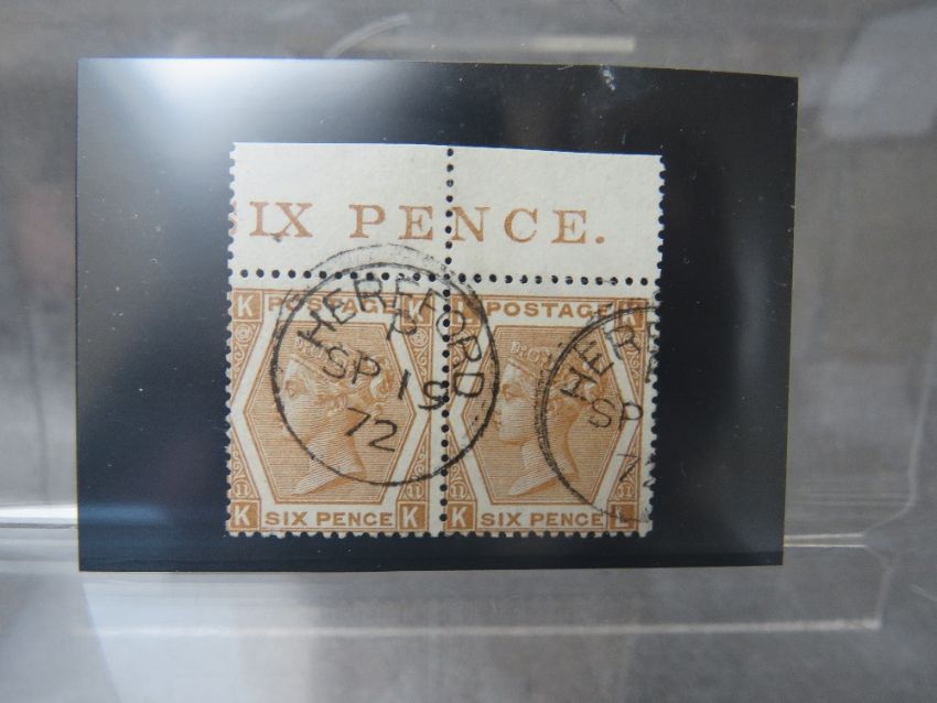 QV A SUPERB USED PAIR OF 6D CHESTNUT, plate 11, marginal inscription 'SIX PENCE' Hereford Sept 19 1872 CDs