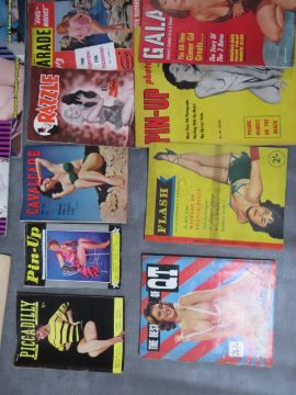 A TRAY CONTAINING 22 VINTAGE GLAMOUR MAGAZINES, to include 1950s examples, Flash, QT, Gala, Pin Up, High Life and Adam International included