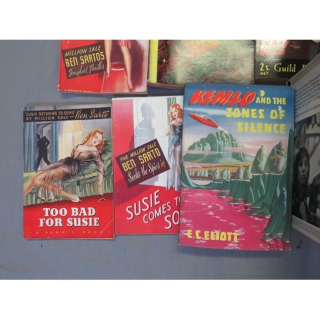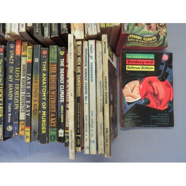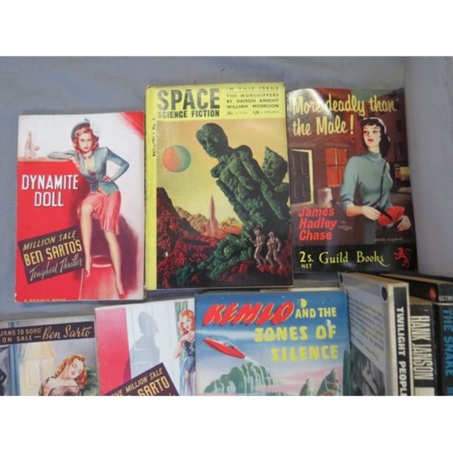 A TRAY OF VINTAGE PULP PAPERBACK BOOKS, to include Mickey Spillane, Hank Janson etc., and vintage science fiction