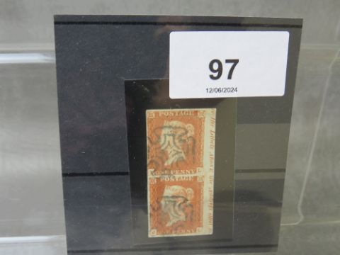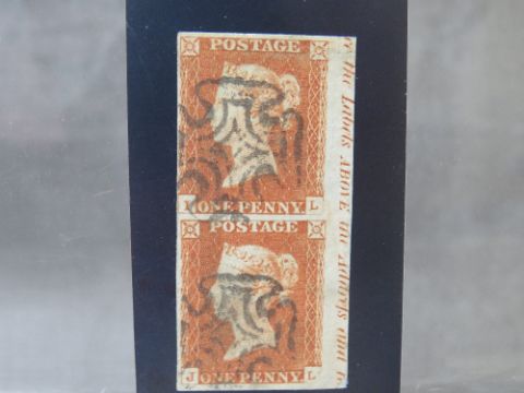 QV FINE USED 1D RED PAIR, plate 21, imperfs, with marginal inscription