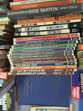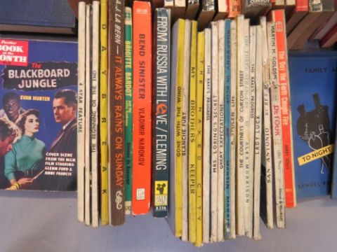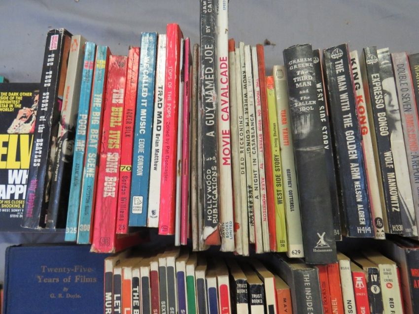THREE TRAYS OF VINTAGE PAPERBACK BOOKS, one of film tie-ins, one of TV programme tie-ins and one of music interest