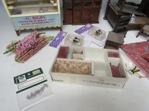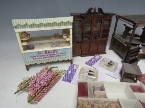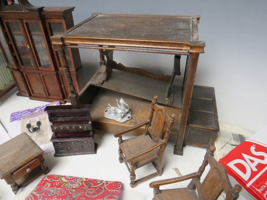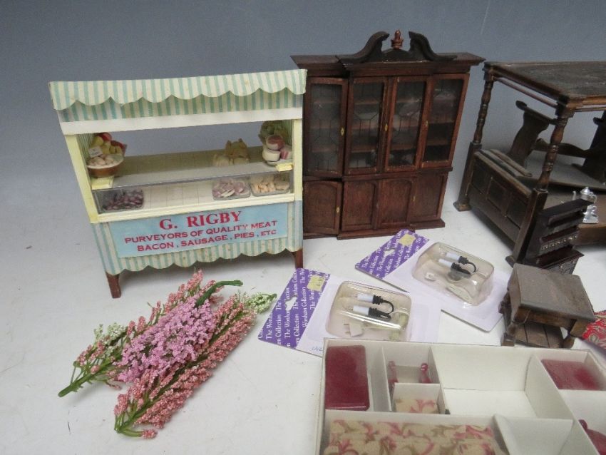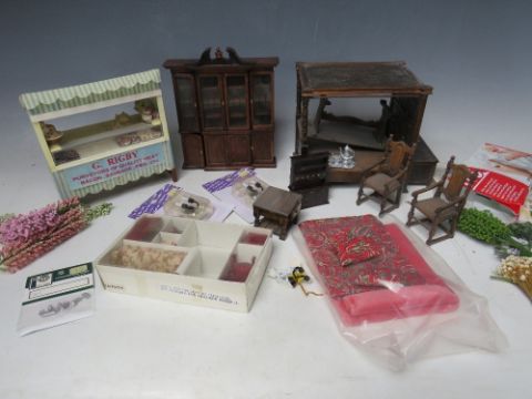 A SMALL TRAY OF DOLLS HOUSE FURNITURE, to include a four poster bed, table and chairs, dresser, wall cabinet, lights, settee, meat stall etc.
