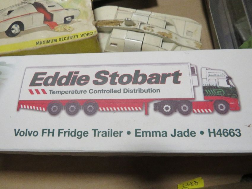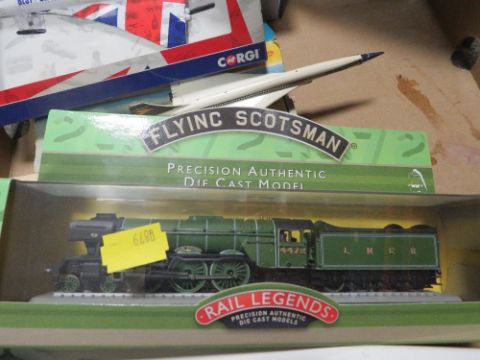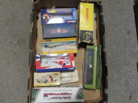 A TRAY OF BOXED DIE CAST VEHICLES, to include Dinky 20 ton lorry mounted crane (box A/F), Dinky Maximum Security vehicle (box A/F), Corgi Concorde (box A/F), Corgi Concorde GS84006, Corgi Bloodhound, Eddie Stobart Volvo Emma Jade H4663, 1:120 scale Corgi Flying Scotsman etc.