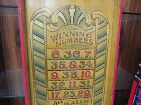 WINNING NUMBERS, A MID 20TH CENTURY PAINTED WOOD FAIRGROUND BAGATELLE TYPE GAME BOARD, painted surfaces with cut out score holes, 46 cm x 137 cm