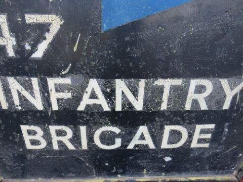 A LARGE VINTAGE DOUBLE SIDED HQ47 INFANTRY BRIGADE WOODEN PAINTED SIGN, approx 124 x 124 cm