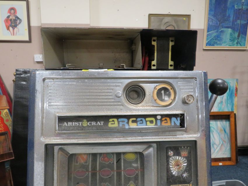 A VINTAGE ARISTOCRAT ARCADIAN FIESTA BONUS 1p ONE ARM BANDIT A/F, H 72 cm