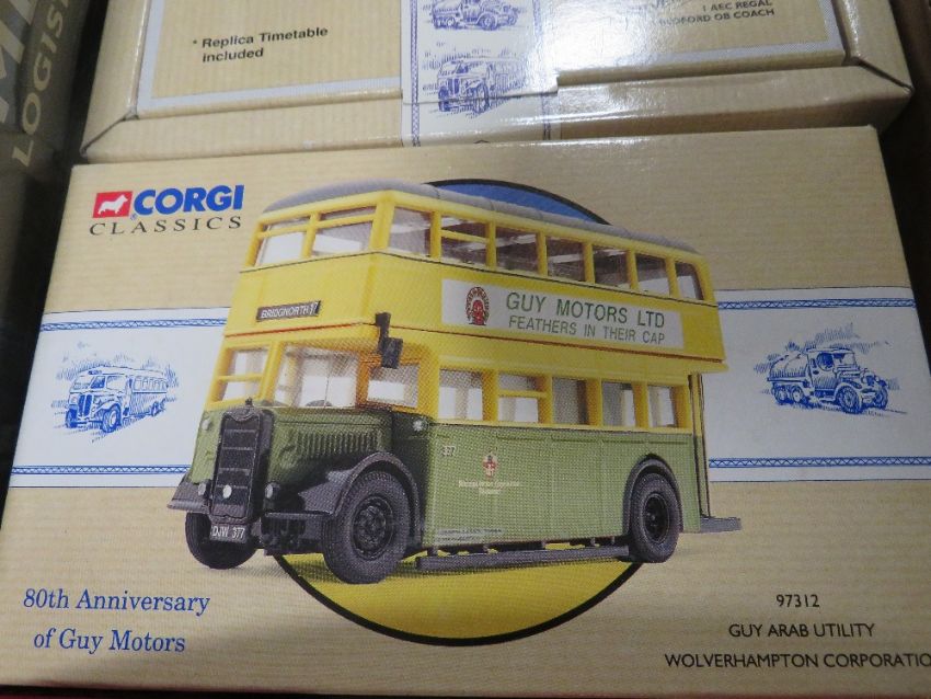A TRAY OF MIXED BOXED DIE CAST VEHICLES, to include Corgi Pollock articulated lorry and trailer with sheeted load 23301, Corgi Classic Cheshire Simon Snorkel fire engine 32001, D Ward Albion platform lorry 26101, Corgi Classic Guy Arab Wolverhampton bus 97312, Corgi Classic Cadbury Bedford tanker 22601, Corgi Double Cadbury Bedford tanker 22601, Corgi double coach set (AEC Regal and Bedford OB), Corgi Slumberland Beds Bedford van 97085, Corgi NSPCC Bedford van 97123 and an Omega Securicor Logistics articulated lorry and trailer