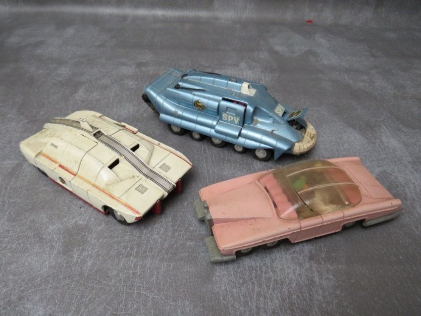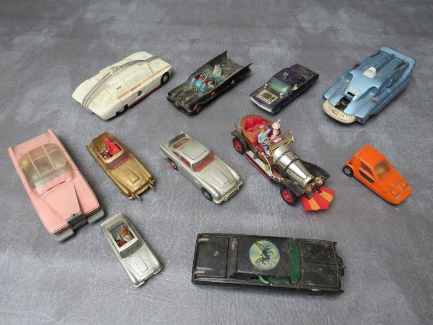 A SMALL TRAY OF TV AND FILM RELATED UNBOXED DIE CAST VEHICLES, to include Dinky Thunderbirds Lady Penelopes FAB1 car, Dinky maximum security vehicle, Dinky spectrum pursuit vehicle, Corgi Black Beauty Green Hornet car, Corgi Man from Uncle Oldsmobile, Corgi 007 Aston Martin DB5, Corgi Chitty Chitty Bang Bang etc.,