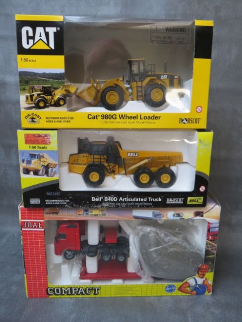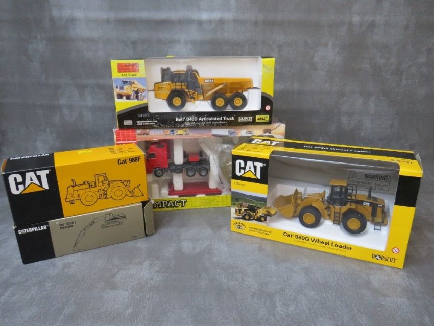 FIVE BOXED DIE CAST VEHICLES, to include 1:50 scale CAT 980G wheel loader, 1:50 scale Bell B40D articulated truck, 1:50 scale CAT 988F wheel loader, 1:50 scale excavator and 1:50 scale Joal Volvo FH16 Globetrotter XL