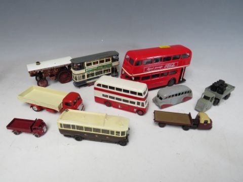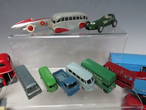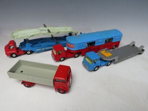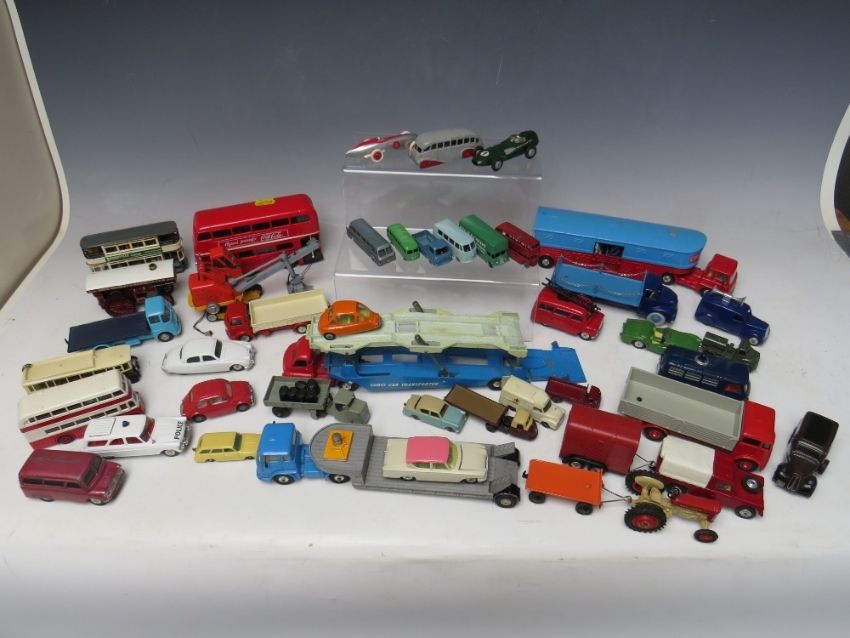 A TRAY OF PLAYWORN VEHICLES BY MAINLY CORGI, Lesney Triang etc., to include vintage examples, Corgi Major articulated horse box, Corgi Major Carrimore car trasnporte, Solido double decker bus included