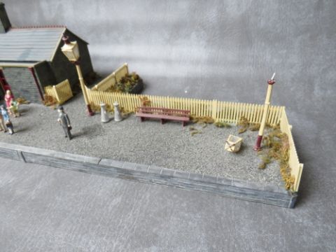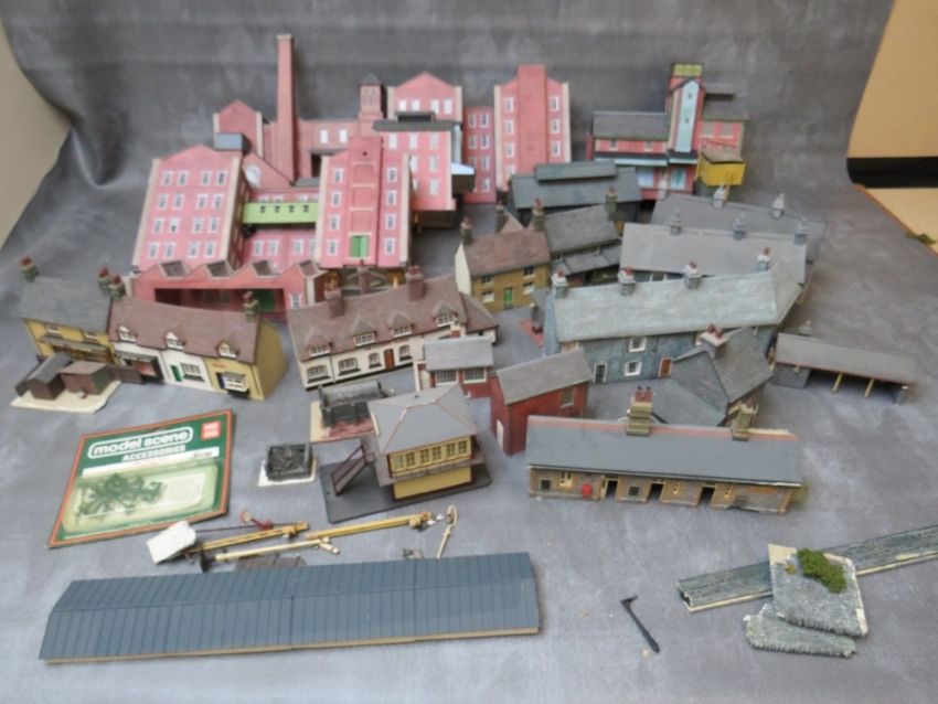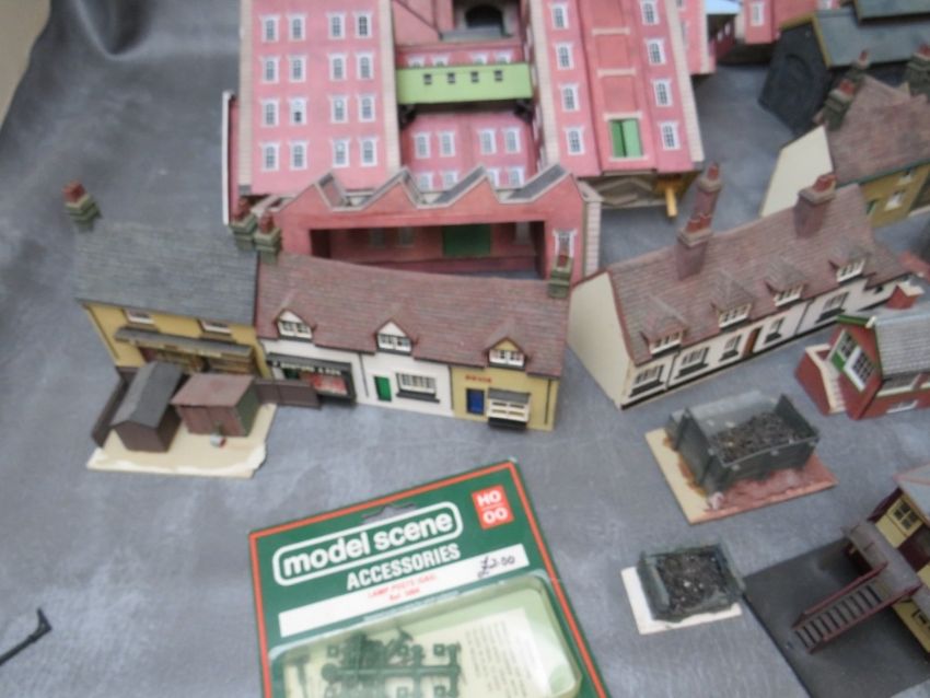 THREE BOXES OF 00 GAUGE BUILDINGS, both plastic and card, together with 00 gauge model station building, people, lights, fencing etc., approximate L 105 cm