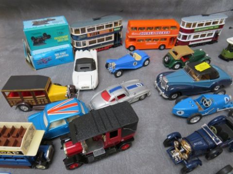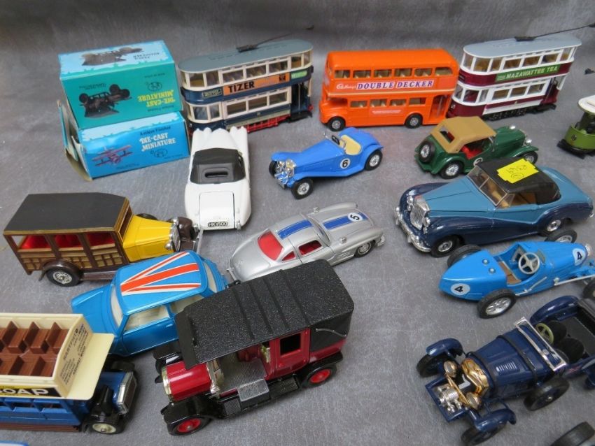 A TRAY OF UNBOXED DIE CAST A TRAY OF UNBOXED DIE CAST VEHICLES, to include cars, buses, trams, fire engines, horse drawn etc., by Corgi, Matchbox etc., approximately sixty pieces in total