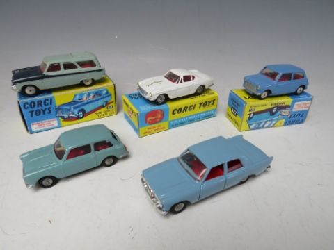 FIVE BOXED CORGI VEHICLES, to include 'The Saint's car 258', Morris Minor Mini 226, Ford Zephyr 226, Karrier 'Banatm' Lucozade van 411, Commer Ambulande 463, together with a boxed vintage Dinky Austin Atlantic 106, an Atlas Dinky Bedford van 482 and four Spot On vehicles to include milk float, Ford Zephyr, Austin A40 and Jensen